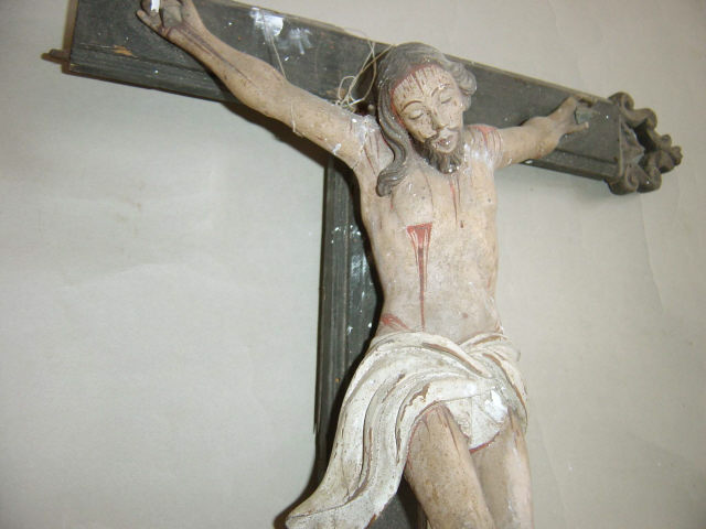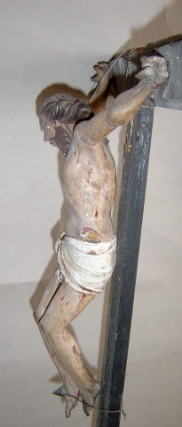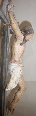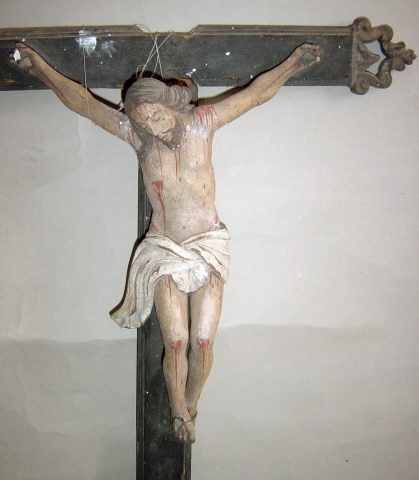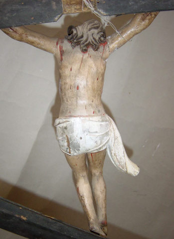 Cruz de altar com a imagem de Cristo morto, crucificado com os braços assimétricos exibindo os dedos dobrados, na mão direita o polegar e médio tocam-se, leve inflexão do eixo do corpo em contraposto com a cabeça pendendo sobre o lado direito, pernas flectidas pregadas com o pé direito sobre o esquerdo. Rosto alongado marcado pelo nariz proeminente e lábios carnudos emoldurados pelo bigode fino e barba bífida. O cabelo pouco volumoso enrola para trás no lado esquerdo, permitindo visualizar a parte inferior da orelha, e deixa uma madeixa cair sobre o lado oposto do peito. Volumes anatómicos pouco trabalhados, tronco esguio com o ventre comprimido e zona do baixo-ventre coberta por cendal branco marcado por pregueado anguloso atado ao centro, ponta direita esvoaçante e parte posterior sem modelado. Imagem repolicromada num tom claro, exibindo diversos ferimentos com sangue escorrente, sobretudo decorrentes da crucificação e coroação com espinhos, lançada no lado direito do peito e ferimentos nos ombros e joelhos. Cruz latina lisa com terminações superior trilobadas, com o centro recortado, assente sobre base de perfil troncocónico com a parte central destacada.