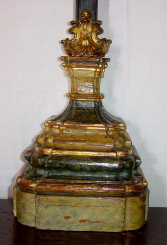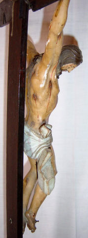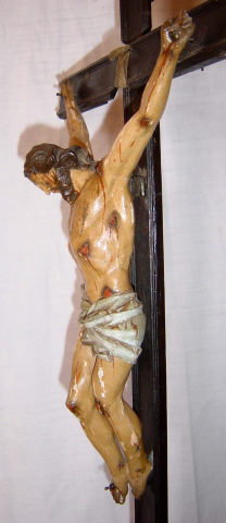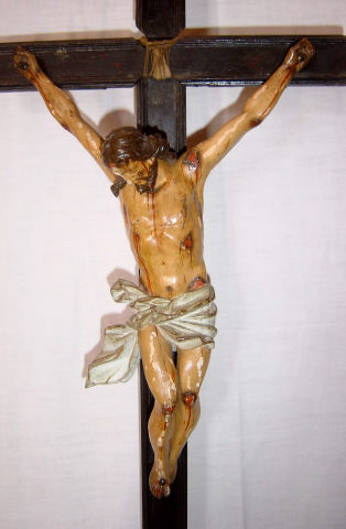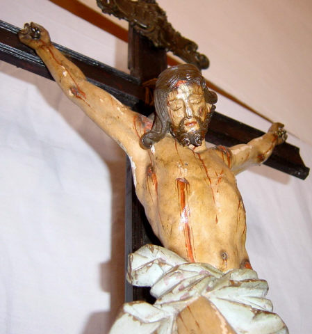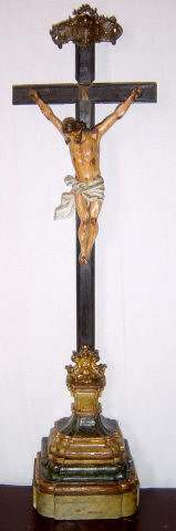 Cruz de altar com a imagem de Cristo morto, crucificado com os braços assimétricos, inflexão do eixo do corpo e cabeça caindo sobre a direita, pernas flectidas pregadas com o pé direito sobre o esquerdo. Tronco robusto com o ventre comprimido e zona do baixo-ventre coberta por cendal branco atado com laçada esvoaçante à direita, e marcado por pregas angulosas. Imagem repolicromada exibindo diversos ferimentos com sangue escorrente, sobretudo decorrentes da crucificação e coroação com espinhos, lançada no lado direito do peito e ferimentos nas faces e joelhos e tronco. Cruz latina lisa alteada, formando uma espécie de degraus com a parte central reentrante, respectivamente pintada de azul claro, azul-escuro e creme. O registo superior estreita em direcção ao topo e é moldurado a meio e rematado por motivo em talha dourada. Possui tabela em prata, formando pano com INRI, florenciado, com as pontas pendendo, encimado por teoria de flores.