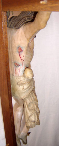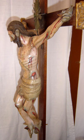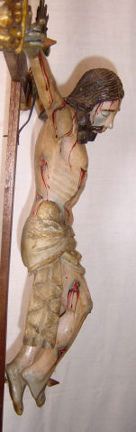 Cruz de altar com a imagem de Cristo morto, crucificado com os braços assimétricos a abençoar com ambas mãos. Cabeça pendendo sobre o lado direito, deixando uma madeixa ondulada sobre o peito, e pernas flectidas pregadas com o pé direito sobre o esquerdo. Possui o rosto muito alongado com os olhos fechados, marcado pelo nariz fino e lábios emoldurados pelo bigode e barba bífida. O cabelo pouco volumoso dirigido para trás no lado esquerdo permite visualizar a orelha e é marcado por incisões paralelas. Volumes anatómicos acentuados, tronco robusto exibindo a caixa torácica pronunciada e o ventre comprimido, braços e pernas revelando alguma tensão muscular. Zona do baixo-ventre coberta por cendal branco marcado por pregueado quase horizontal, paralelo, atado em laçada no lado direito da anca deixando cair uma ponta com duas faixas de pregas escalonadas simétricas. É debruado por renda dourada. Imagem com repintura exibindo zonas mais escuras e diversos ferimentos com sangue escorrente, sobretudo decorrentes da crucificação e coroação com espinhos, lançada no lado direito do peito e ferimentos na face, braços e joelhos. Cruz latina lisa (recente) com terminações superior trilobadas em talha dourada, assente em base rectangular (recente) com três registo em degrau. Cravos em madeira.