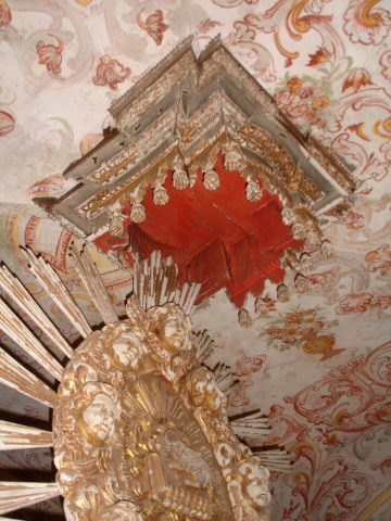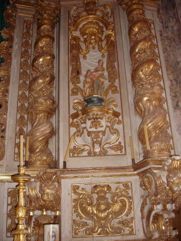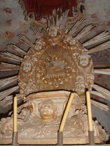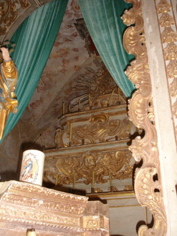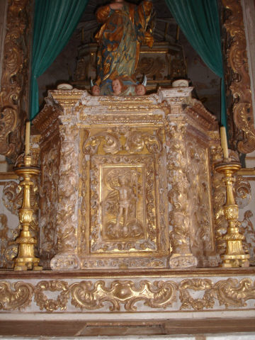 O banco apresenta quatro mísulas decoradas por querubins emplumados e grinaldas; os tramos laterais são preenchidos por cartelas "rocaille". Ao centro eleva-se sacrário de planta trapezoidal, com quatro colunelos de espiras, enrolamentos de acantos e porta decorada por baixo-relevo com a imagem de Cristo Ressuscitado. Corpo tetrástilo, com colunas de tipo berniniano ornamentadas por grinaldas de flores. Os tramos laterais ostentam mísulas a que correspondem, no alçado, dosséis com concheados e panejamentos. Ao centro abre-se a tribuna, em arco redondo, emoldurado por rocalhas e festões. O trono, de andares, é decorado por cartelas, grinaldas e querubins. Encimado por baldaquino, ovalado, decorado por «Agnus Dei» sobre o Livro dos Sete Selos e dossel de borlas.