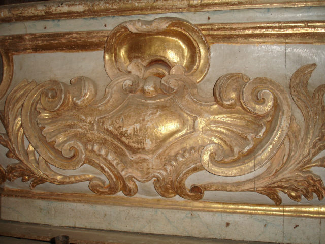Entablamento liso, interrompido no tramo central. O ático, com frontão rectangular, entre meias-pilastras, é rematado por grande cartela "rocaille", e flanqueado por aletas e segmentos de frontão curvo.