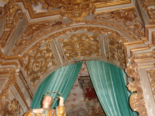 Retábulo de planta côncava composto por banco, corpo de três tramos e ático.