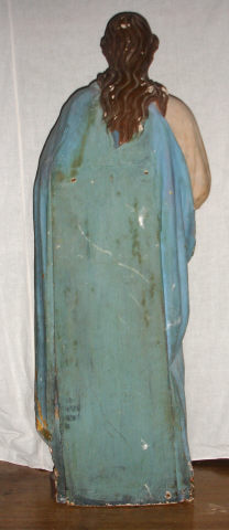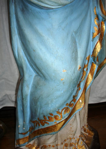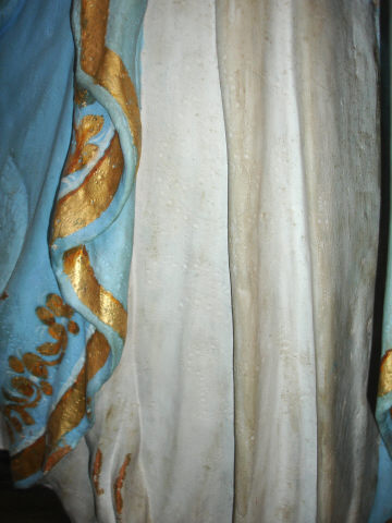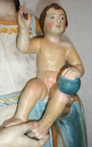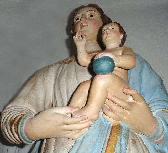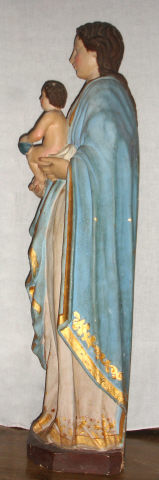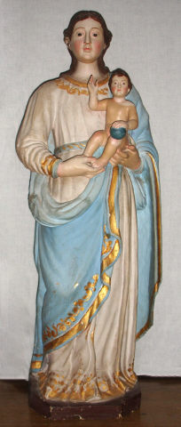 Nossa Senhora de pé e frontal em atitude hierática e de distanciamento, acariciando o pé, do Menino Jesus, sentado sobre a mão esquerda. A estrita frontalidade da postura apenas é interrompida pela flexão da perna direita, para onde dirige o olhar baixo. Possui o rosto sereno de desenho ovalado e faces cheias, emoldurado pelo cabelo comprido pouco destacado, enrolando para trás na zona das orelhas, onde cai compacto desenhando madeixas onduladas largas e estilizadas. Menino Jesus desnudo e frontal, mantendo as pernas inclinadas para a direita, saúda com a mão direita e mantém a sinistra sobre Orbe azul, colocado sobre este joelho. Nossa Senhora enverga um vestido branco, cingido na cintura, sem alterar a cadência vertical do pregueado, registando apenas a volumetria do pé ligeiramente avançado e a flexão insinuada da perna. É envolvida por manto azul lançado do lado esquerdo, que cai transversalmente pelas costas e cruza a cintura destacando-se a dobra de drapeado mais volumoso. Vestes totalmente repolicromadas apenas decoradas nas cercaduras por faixa lisa e filete de cariz fitomórfico, a dourado, deixando perceber ainda decoração puncionada. Incorporada em base estreita pintada de castanho.