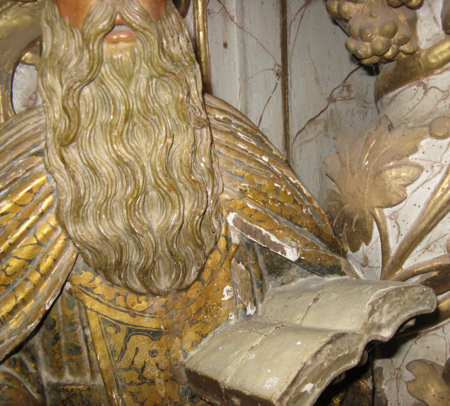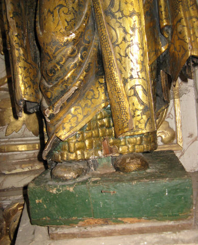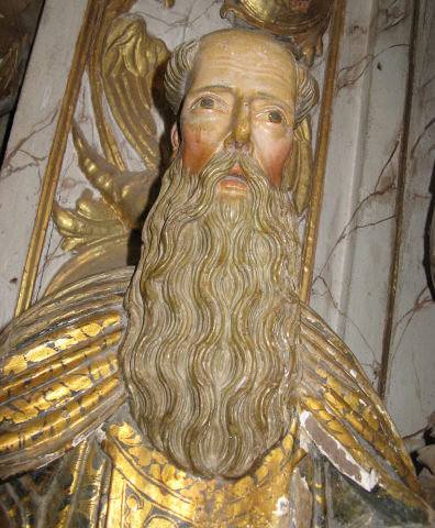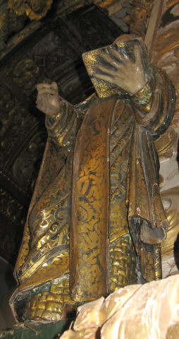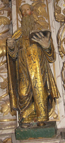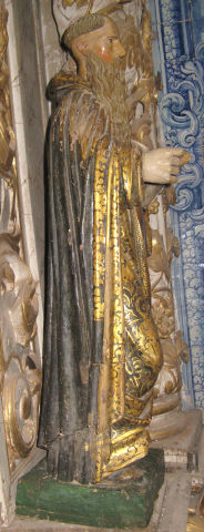 São Paulo eremita de pé, em posição de estrita frontalidade e hieratismo apesar do ligeiro avanço da perna direita, com os braços projectados, o direito exibindo os dedos dobrados, onde seguraria atributo omisso, e com um livro aberto totalmente assente sobre a sinistra, algo desproporcionada. Representado enquanto ancião de longas barbas grisalhas e tonsura tubular interrompida, pela evidente calvície, desenvolvendo-se acima das orelhas, vê a idade avançada igualmente comprovada por rugas na testa e faces ossudas. Em atitude de contemplação possui os grandes olhos rasgados ligeiramente elevados, nariz fino e os lábios entreabertos, quase ocultos pelos longos bigodes que encontram a barba compacta marcada por madeixas simétricas onduladas, que caem sobre o peito ampliando o alongamento da cabeça. Enverga hábito cingido, escapulário e capa fechada sobre o peito, oculta pelas barbas, que cai abaixo dos joelhos e está fixa pelo braço esquerdo, assim como o hábito revelando veste interior relevada por padrão quadriculado. Vestes marcadas por pregueado vincado, registando a flexão da perna direita, nomeadamente na orientação do escapulário. Decoração estofada simulando brocado do século XVI-XVII, no escapulário com motivos florais estilizados e folhagem acantiforme. Parte posterior policromada de preto mas sem decoração. Assenta em base rectangular, verde, e possui sapatos redondos igualmente estofados com pequenos círculos centrados.