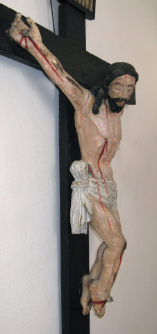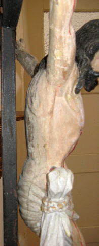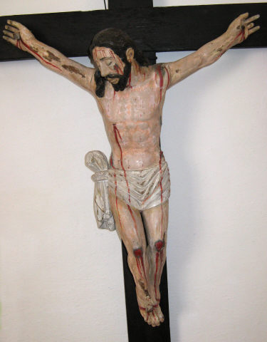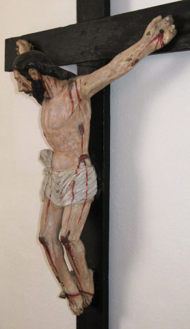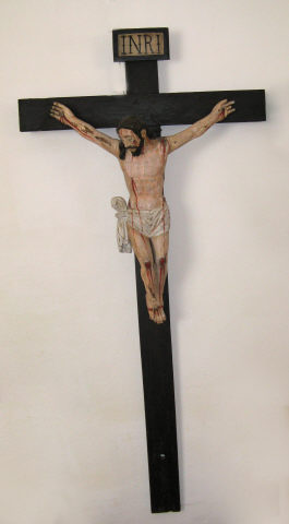 Imagem de Cristo crucificado morto, aposto em crucifixo liso de configuração latina. Possui a cabeça perfilada e tombada à direita, braços verticalizados e pernas flectidas com cravação conjunta dos pés, o direito sobre o esquerdo. Rosto alongado e sereno mantendo os olhos fechados, destacando-se o nariz proeminente e lábios grossos, emoldurados por barba bífida de modelação sumária quase inexistente. O cabelo pouco volumoso deixa a descoberto a orelha esquerda e uma madeixa ondulada caindo sobre o lado oposto do peito. Volumes anatómicos monolíticos e desproporcionados, sobretudo nos braços, revelando maior cuidado a caracterização do tronco, apesar da rigidez e estilização. Zona do baixo-ventre coberta por cendal branco de formato rectangular, marcado por pregueado concêntrico em V, que ata sobre a anca direita em laçada hirta. Imagem repolicromada em tom claro, dramatizada ferimentos convencionais donde correm finos fluxos de sangue. Colocação superior de tabela, rectangular, no topo da cruz.