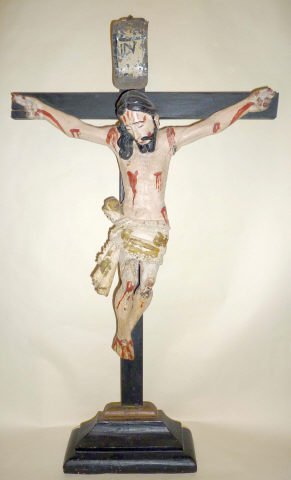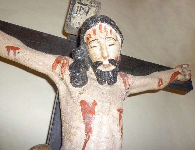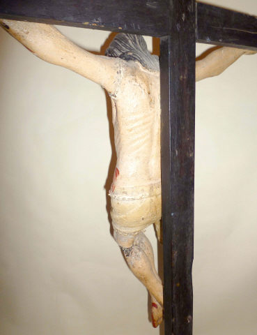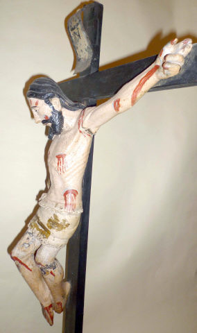 Cristo crucificado representado morto com os braços compridos e horizontalizados, a abençoar, e a cabeça tombada à direita iniciando leve curvatura corporal finalizada nas pernas, flectidas cravadas conjuntamente com o pé direito sobre o esquerdo. Possui o rosto muito alongado, determinado pela barba bífida que toca o peito, bigode desunido e cabelo pouco destacado com uma madeixa grossa e ondulada caindo no lado direito do peito. Imagem de características populares e seriadas, desde logo pela desproporção e rigidez no modelado da anatomia, estilizada, e cendal, atando em laçada sobre a anca direita. Deixa a ponta rígida destacada da perna, e é debruado por corda natural desenhando semicírculos. Imagem repolicromada de modo grosseiro designadamente nos ferimentos convencionais e fluxos de sangue. Cruz de configuração latina recente, assim como a base rectangular alteada em três registos para o topo. Parte posterior da base de formato semi-circular para a dotar de maior estabilidade, muito recente.