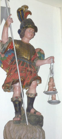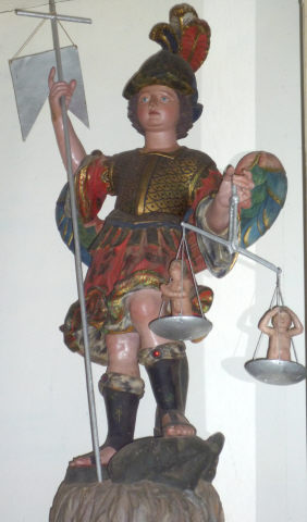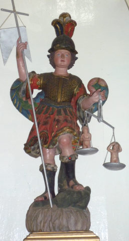 São Miguel Arcanjo alado e trajando vestes de legionário romano, em representação convencional que reflecte as principais funções que lhe são atribuídas: de comandante do exército celeste e de condutor de almas, respectivamente traduzidas por um pendão, cuja haste envolve com a mão direita erguida, e por uma balança, na sinistra, com a qual pesará as almas no dia do Juízo Final. Pose frontal acusando alguma inclinação para a esquerda reflectindo a colocação da perna flectida em pequeno afloramento rochoso sobre nuvem estilizada. O rosto imberbe, olhos azuis fixos e lábios cerrados ensaiando um sorriso, está encimado por capacete emplumado deixando visualizar lateralmente o cabelo enrolando para trás. As vestes compõem-se da habitual de cota ajustada com fitas caindo sobre o saio de túnica curta com mangas pelo cotovelo, com o rebordo inferior de volumetria mais movimentada e destacada. Calça sandálias de cano alto centradas em cima por vidro vermelho. Na balança duas alminhas ajoelhadas, uma com as mãos colocadas sobre a cabeça, a outras com as mãos postas frente ao peito e rosto elevado. Encaixam nos pratos atrávés de pequenos espigões de madeira.