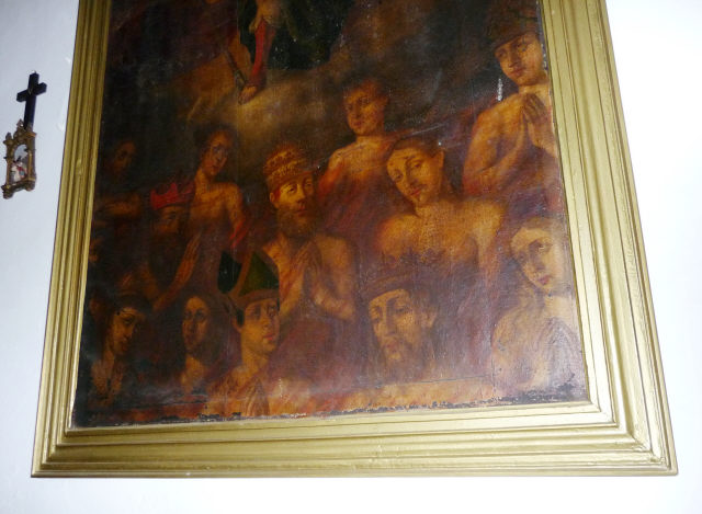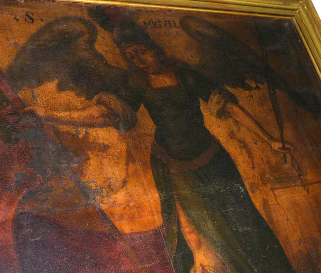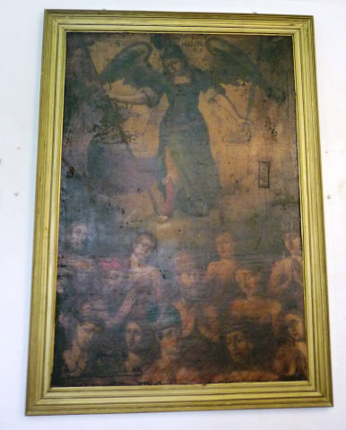 São Miguel, ao centro, na metade superior do quadro, com um clarão luminoso em fundo, de asas abertas, veste como soldado romano, enquanto segura na esquerda uma palma e, na direita, uma cruz com uma flâmula, com as palavras - "QVIS VT DEVS", a drapejar. Por cima do arcanjo a legenda: "S. MIGVEL". Na parte inferior, em posições variadas, entre chamas, 12 figuras nuas, a meio corpo. Apenas em algumas a cobertura da cabeça permite identificar as funções: Papa, rei, nobre, religioso.