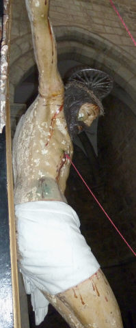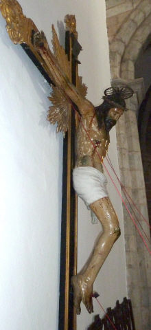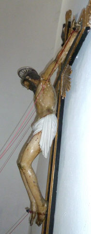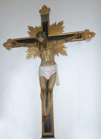 Cruz de altar com a imagem de Cristo morto, crucificado com os braços esticados, horizontalizados, cabeça tombada à direita em contraposto com a orientação das pernas flectidas pela cravação conjunta dos pés, o direito sobre o esquerdo. Rosto largo expondo algum sofrimento patente nos olhos e lábios quase cerrados, o lábio superior oculto pelo bigode, alguma proeminência dos ossos faciais e nariz fino. Cabelo e barba escorridos, marcados por incisões ondulantes. O cabelo deixa visualizar a orelha esquerda e, no lado oposto, uma madeixa repousa no peito, assim como a barba subdividida em duas melenas pontudas. Anatomicamente destaca-se a estrutura maciça do tronco com marcação mais acentuada da estrutura óssea e retracção muscular, relativamente aos membros longos e esguios. Cendal branco de formato rectangular e drapeado suave interpretando a volumetria das pernas, formando um saio que vai estreitando em direcção à anca esquerda donde pende uma ponta hirta rematada por pregas escalonadas. Imagem repintada em tom escuro, acentuado pelo verniz oxidado, pontuada por alguns ferimentos e macerações para além dos convencionais, donde escorrem fluxos sanguíneos. Cruz de configuração latina, emoldurada por faixa saliente e dourada, assim como as terminações trilobadas e resplendor quadrangular de raios setiformes.