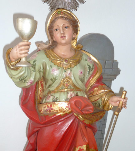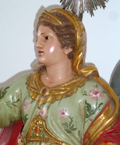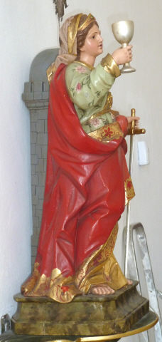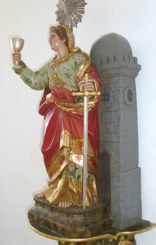 Santa Bárbara de pé e frontal em pose encenada estruturada pelo arqueamento do corpo resultante da colocação concertada da cabeça, olhando em direcção ao cálice que segura com o braço projectado, e perna flectida mantendo o pé a tocar parcialmente a base. O antebraço esquerdo prolonga-se lateralmente no espaço segurando a guarda de uma espada cuja ponta encontra a base. Neste lado, por trás da figura, outro dos seus mais emblemáticos atributos iconográficos, uma torre eleva-se acima do ombro. Possui o rosto sereno e bem desenhado, de feições clássicas e lábios entreabertos. Cabelo comprido estruturado lateralmente por uma tiara triangular. Panejamento composto por véu, vestido verde, com decote e cinto elaborados, e manto vermelho. Drapeados angulosos que refletem bem o efeito visual de profundidade, sobretudo na parte inferior do saio, e o movimento de colocação, designadamente no manto a interpretar a flexão da perna e o modo como as pontas do manto se unem na parte frontal, com nó descaído à esquerda. O vestido é decorado com pés florais policromados, e exibem cercaduras douradas. Calça sandálias. Base de planta rectangular, cantos cortados, faixa central alteada e de perfil côncavo. Pintura de fingimento marmoreada em tons de castanho e preto.