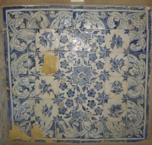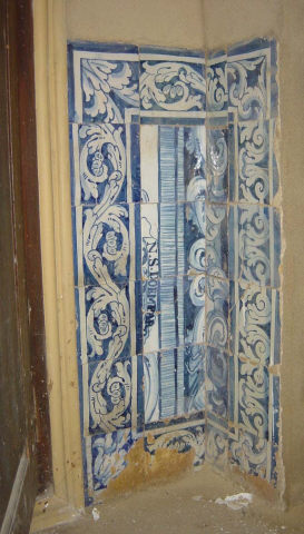 3.º Painel - silhar com azulejos de figura avulsa, com 4 x 6 peças e cercadura de enrolamentos fitomórficos com filetes na extremidade exterior - trata-se possivelmente de azulejo de barra adaptado a cercadura. Azulejos decorados com flores, motivos da fauna e barco. Num dos cantos é rematado por friso de godrões.