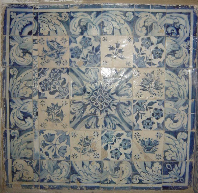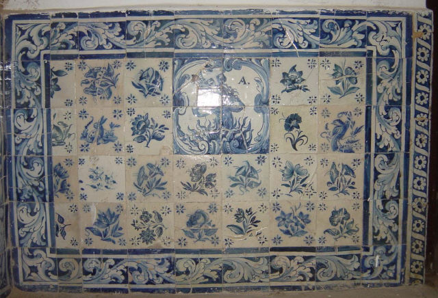 1.º Painel - silhar com azulejos de figura avulsa, com 4 x 6,5 peças e cercadura de enrolamentos fitomórficos entre filetes azuis. Todas as peças são decoradas com flores, excepto os D4, D5, C4, C5 que formam um registo com «alminha» em cartela barroca.