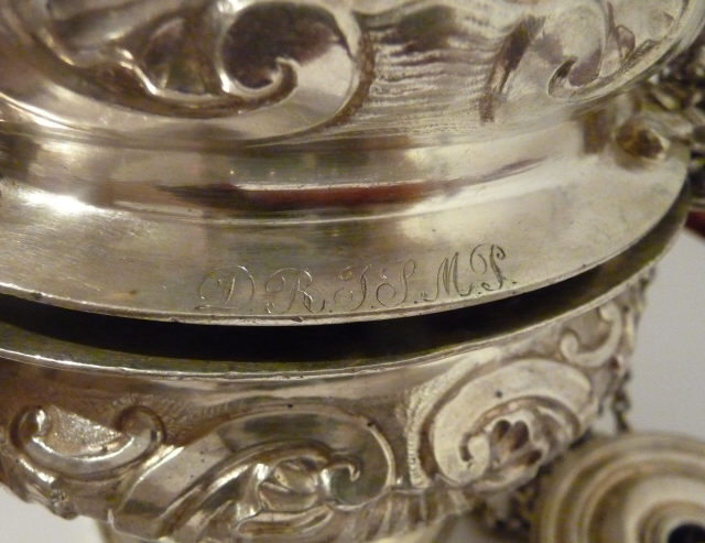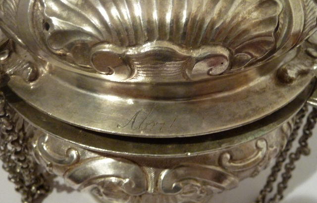 Turíbulo com base circular, ligeiramente alteada, e rebordo emoldurado. Caldeira de secção circular, alargada no topo, rematada por faixa lisa de perfil côncavo, com três argolas adossadas para fixação das correntes. É decorado por concheados simétricos, volutas, rocalhas e motivos florais. Chaminé com aba inferior côncava e lisa, com argolas para passagem das correntes, com a parte superior transfurada e decorada por painéis de concheados e ornamentação idêntica à caldeira. Remate com tarja de folhas de acanto encimada por pináculo.