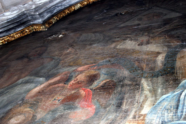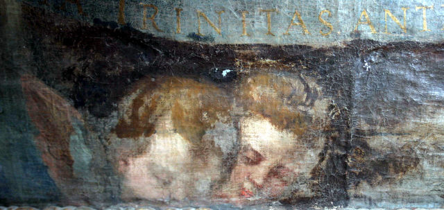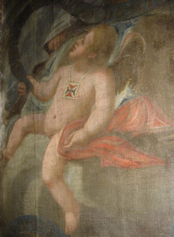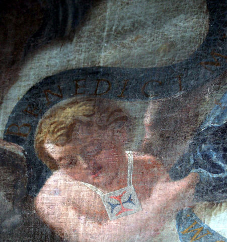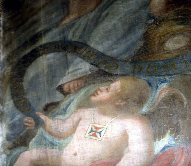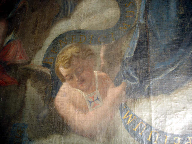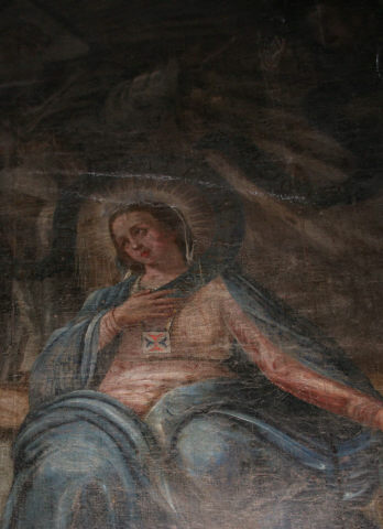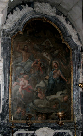 Pintura a óleo sobre tela, de formato rectangular com a parte superior recortada. Na pintura está representada Nossa Senhora com a Santíssima Trindade. Na parte superior, sobre um fundo de nuvens povoadas de anjos encontra-se, do lado direito e sentada sobre uma nuvem, Nossa Senhora vestida de rosa e com um manto azul sobre os ombros. Num ponto mais alto, do lado esquerdo, encontra-se Cristo, com o tronco a descoberto e um manto azul que lhe cobre a parte inferior do corpo e, num ponto mais alto, do lado direito, encontra-se o Padre Eterno e, à sua frente, a Pomba do Espírito Santo. Em toda a volta encontram-se anjos que, tal como a Virgem têm um escapulário ao pescoço. As diferentes figuras seguram filacteras azuis com frases escritas em maiúsculas douradas.