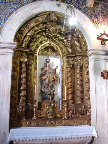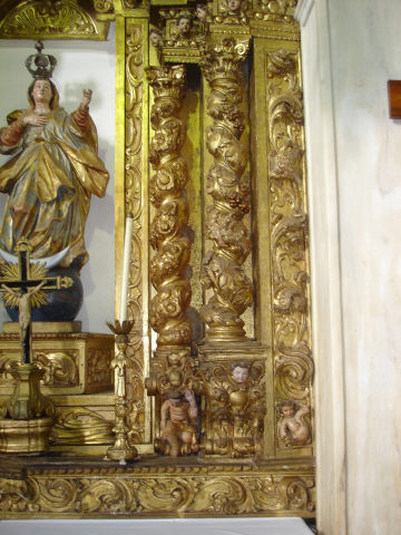 Dois pares de colunas de espiras decoradas por parras, cachos de uvas e flores; pilastras externas decoradas por enrolamentos vegetalistas e meninos, policromados. Entablamento clássico, restrito aos elementos arquitectónicos, pontuado por cabeças de anjos.