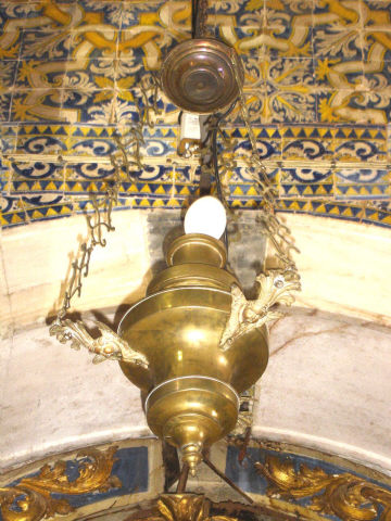 Lâmpada com corpo em forma de urna, com superfícies de perfil côncavo e convexo, rematado por pináculo na extremidade inferior. Três cadeias de suspensão, com elementos móveis vazados, encaixam em querubins com feixe de plumas na parte superior, fixos ao bojo. Disco superior, com argola de suspensão, alteado em ressalto.