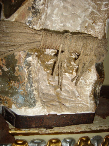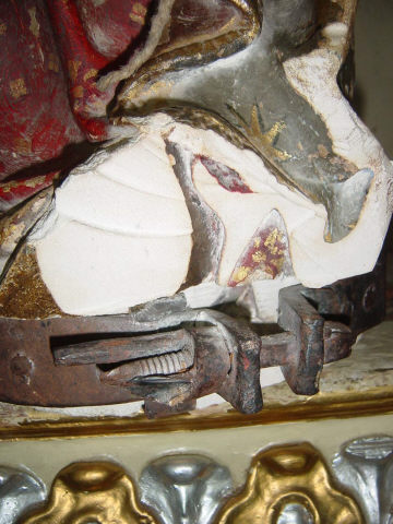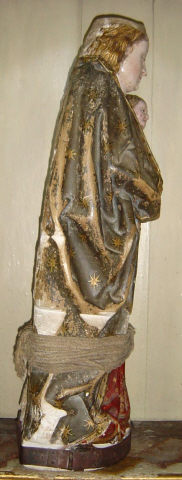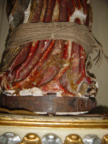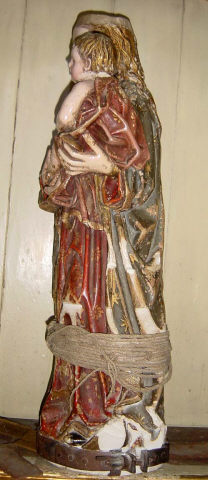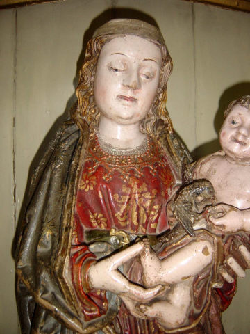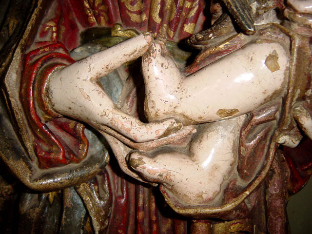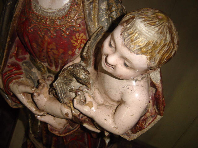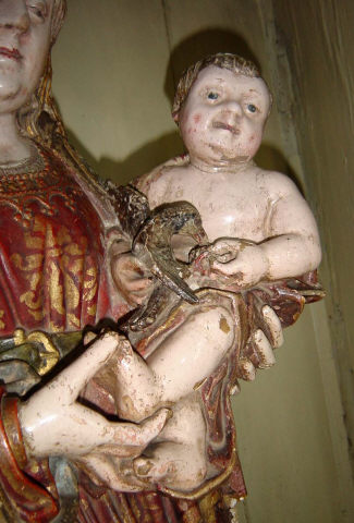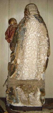 Nossa Senhora, sob a invocação das Candeias, de pé e frontal amparando no lado esquerdo o Menino Jesus sentado. Este está voltado para a direita, denudo e envolvido num pano que lhe cobre as costas e a zona do baixo-ventre. A mão esquerda, colocada sobre o regaço, segura algo que uma pomba debica. Tem a perna direita cruzando sobre a esquerda, cujos pés a Senhora segura delicada e afectuosamente com a mão direita, com o polegar pressiona delicadamente os dedos do pé esquerdo para trás, o indicador e o médio segurando a zona do calcanhar e o mindinho e anelar na parte dos dedos do pé direito. O seu rosto é largo e tranquilo, mantendo os olhos para baixo, quase fechados. A cabeça está coberta por uma espécie de toucado deixando visualizar lateralmetente o cabelo dourado e ondulado que se esconde por baixo do manto. Este toucado provavelmente servia para colocação da coroa, actualmente tem um orifício central. Enverga um vestido vermelho, cingido na cintura, decorado com motivos florais a dourado com o decote relevado e deixando advinhar os seios. É marcado por pregas fundas e cai sobre a base deixando visualizar a ponta do sapato esquerdo, cuja perna está flectida e avançada. É envolvida por um manto azul, exibindo pregueado solto, debruado com cercadura relevada e decorado com estrelas douradas. O Menino tem o rosto redondo, cabelo curto sem volume, caindo sobre a testa marcando entradas. Os olhos são rasgados e o nariz largo, os lábios pouco definidos ensaiam um sorriso formando comissuras na face. Anatómicamente é marcado por linhas cheias claramente pueris. Imagens repintadas. A senhora tem a parte posterior escavada e no terço inferior é envolvida por cordas.