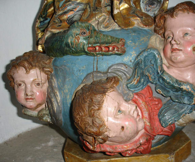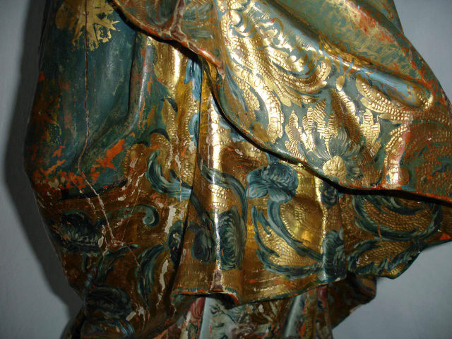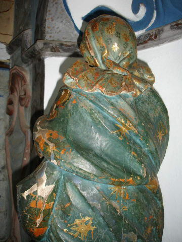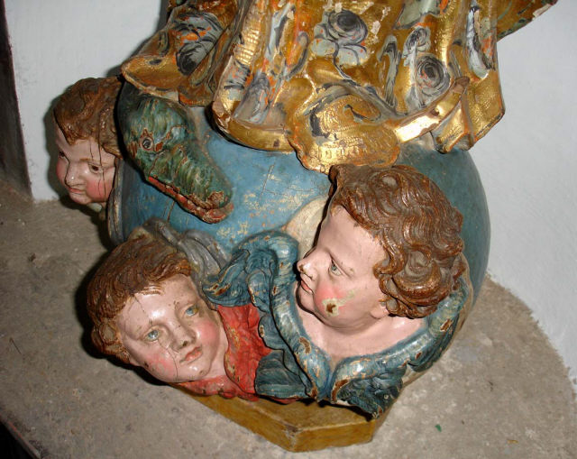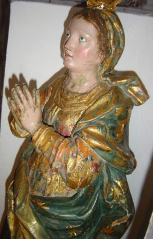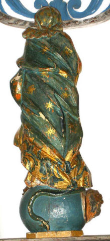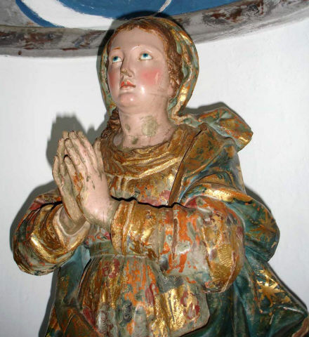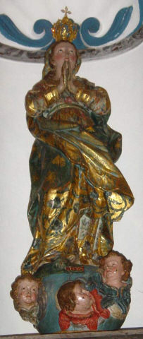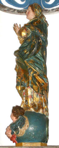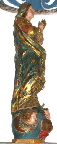 Nossa Senhora da Conceição, de pé e frontal, em atitude orante com as mãos postas frente ao peito. O contraposto é conseguido pela flexão da perna direita com a cabeça, levemente inclinada para o lado oposto e para trás com os olhos azuis ao alto. Ergue-se sobre globo azul figurado por três anjos com asas policromadas, no lado direito surge a cabeça de uma serpente verde e no lado esquerdo tem um pequeno crescente dourado com as pontas voltadas para cima, e cuja parte central está tapada pelo vestido. Possui um véu azul, decorado com motivos florais num tom mais escuro e outros dourados, a cobrir a cabeça, que é cingido ao pescoço e cai esvoaçante por trás do ombro esquerdo. Enverga um vestido cingido na cintura e com decote redondo, e apresenta padrão floral policromo sobre estofo e com alguns apontamentos puncionados. É envolvida por manto azul, com padrão estrelado e debruado por cercadura de larga de motivos assimétricos, dourados e puncionados, e vegetalistas/florais em tons de azul. Lançado e preso pelo braço esquerdo cobre toda a parte posterior, onde exibe pregas transversais, angulosas e movimentadas, coincidentes com o movimento de volteio com que cruza a cintura. O pregueado mais rígido e vertical do vestido, contrapõe-se com o do manto mais movimentado e solto. Os anjos, com as asas em tons de azul e vermelho, ocupam diferentes posições na base, dois têm olhos azuis e estão colocados mais à esquerda, o outro de olhos castanhos está mais destacado no lado direito com o rosto voltado para o observador. Repintes