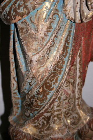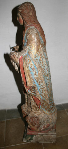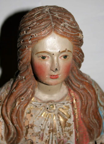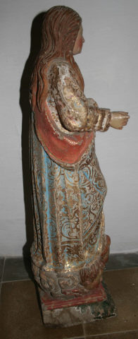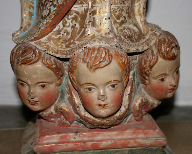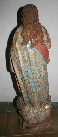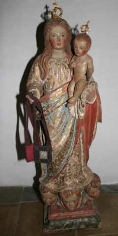 Nossa Senhora do Rosário com o Menino Jesus sentado sobre pano branco que segura na mão esquerda. Imagem hierática de Nossa Senhora frontal, erguendo-se sobre nuvem estilizada, figurada à frente por três anjos com asas policromas (estofadas em tons de vermelho e azul). Tem a perna direita flectida e o braço soerguido e dirigido para a frente, em cujos dedos levemente dobrados devia segurar o rosário (actualmente uns escapulários carmelitas). Possui o rosto alongado e inexpressivo com as faces rosadas, semelhante ao dos anjos e do Menino. É emoldurado por duas madeixas de cabelo comprido exibindo estriado de talhe fundo e levemente ondulado, na parte posterior cai sobre as costas subdividindo-se em três madeixas. Enverga um vestido branco, decorado com motivos vegetalistas dourados, alguns apresentando policromia rosa e azul. O decote redondo é centrado por botão a partir do qual forma pregas radiais. Tem as mangas compridas, a cintura cingida e cai em pregueado vertical e paralelo tapando a parte superior da base. É envolvida por manto azul, com o interior rosa, igualmente estofado com padrão miúdo dourado, que cair transversalmente pelas costas e cruza a cintura a partir do lado direito. O Menino está levemente voltado para a direita, desnudo com a mão direita colocada sobre o peito e a esquerda soerguida e aberta. Tem a cabeça inclinada para este lado e a perna um pouco mais levantada. Possui o cabelo curto, dirigido para a testa formando entradas, à semelhança dos anjos. Imagens repintadas nas carnações, que assentam sobre base de encosto, rectangular alteada e imitando marmoreado, respectivamente azul e rosa. O Menino encaixa em espigão metálico.